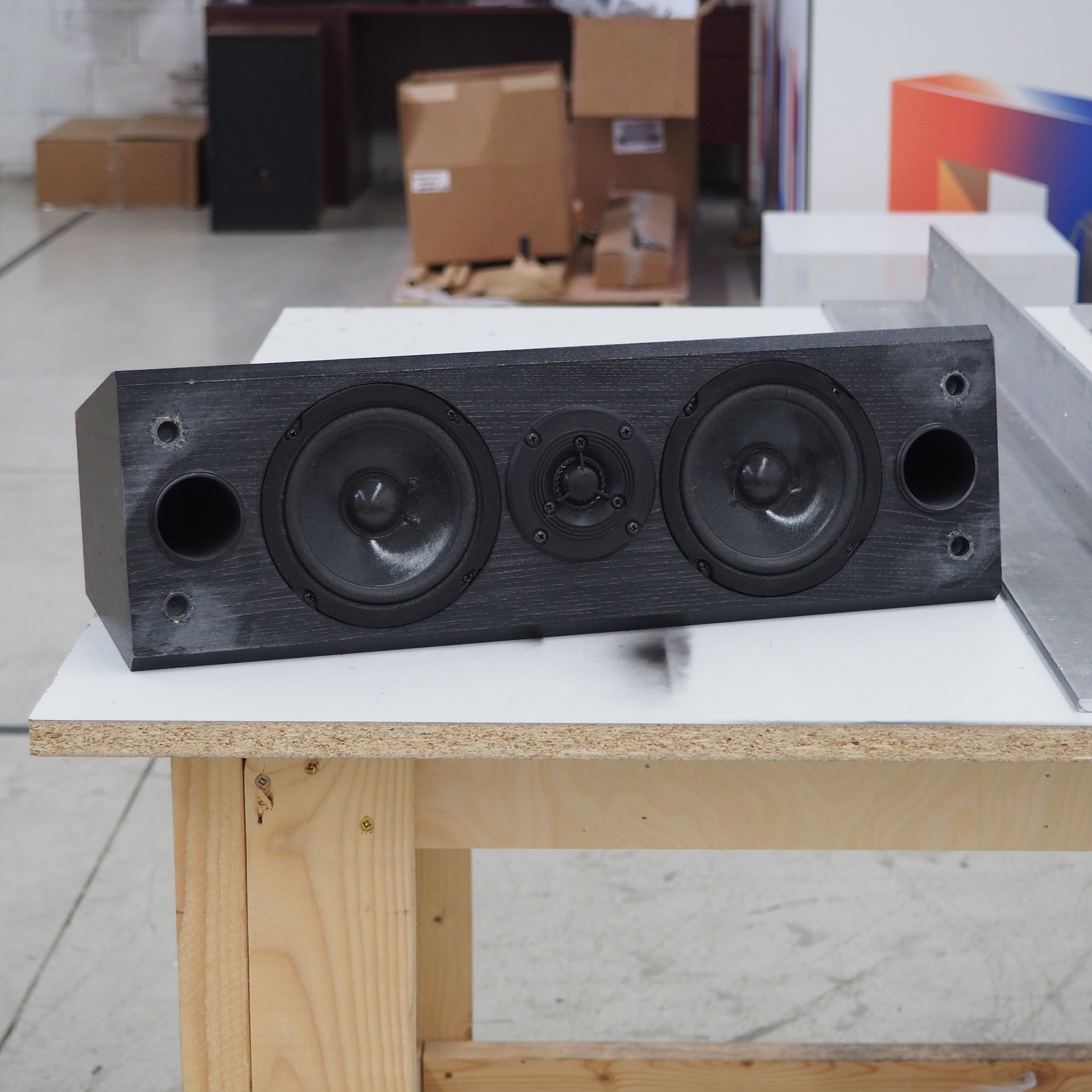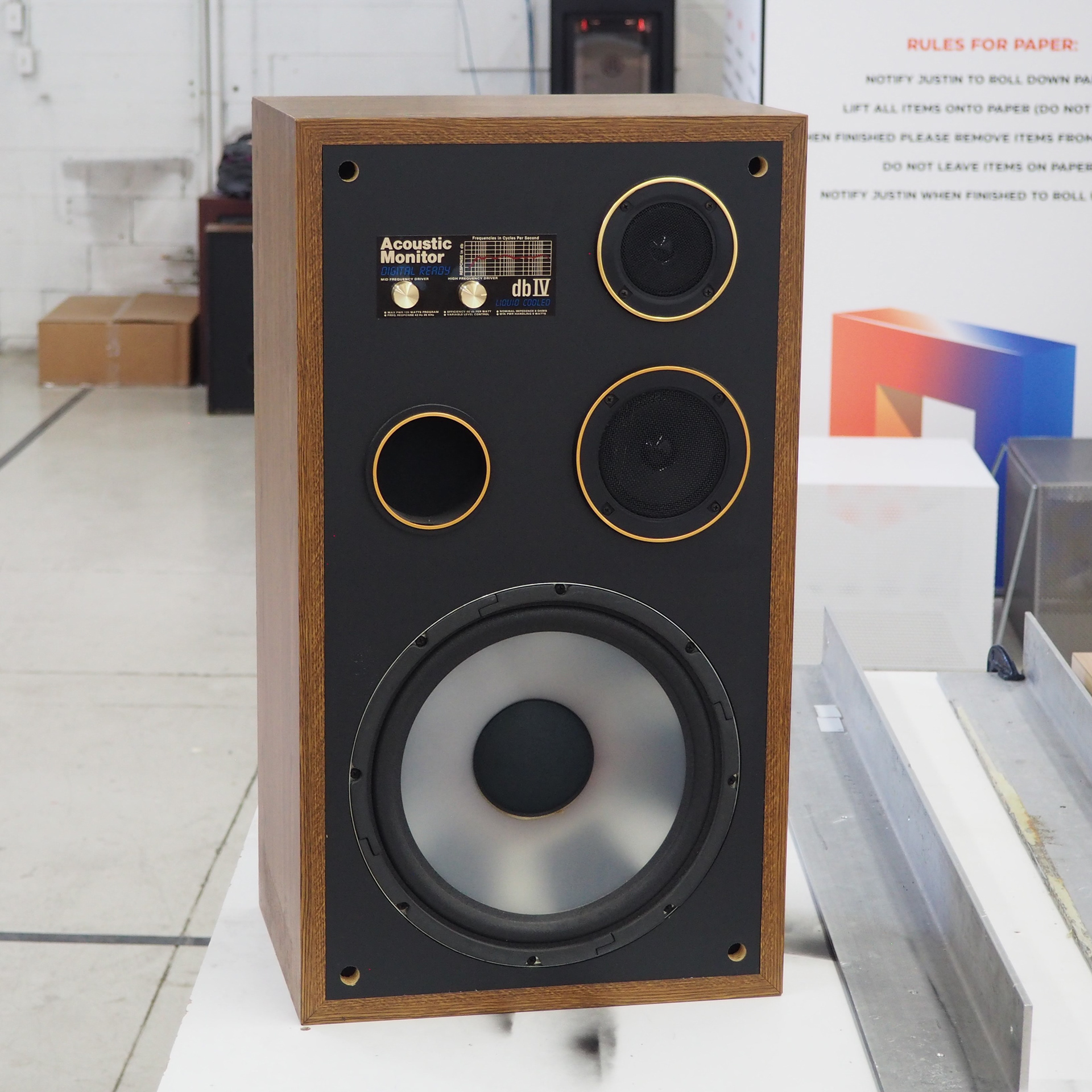 Above is a concept render of my project. I used this image along with a presentation to pitch the idea to the design lead at PragerNuForm. Below are some pictures of what the speakers looked like before altering. My goal is to take a set of old speakers that don't look great and tie them all together into a modern design that brings them new life.